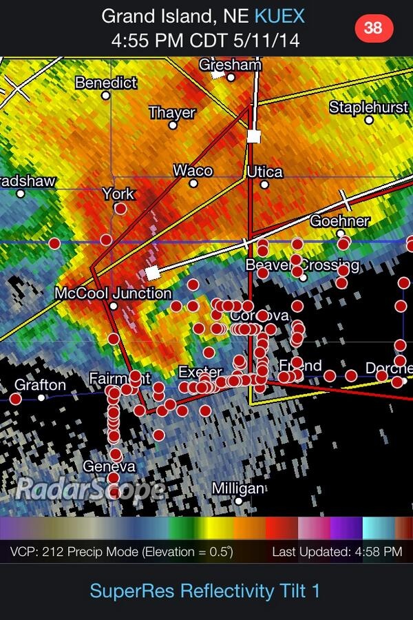 @AndrewGortonWx ·11 uur Some of these storm chasers (red dots) are in a really bad spot near this tornado in Nebraska. #newx pic.twitter.com/p0OoRJtM44