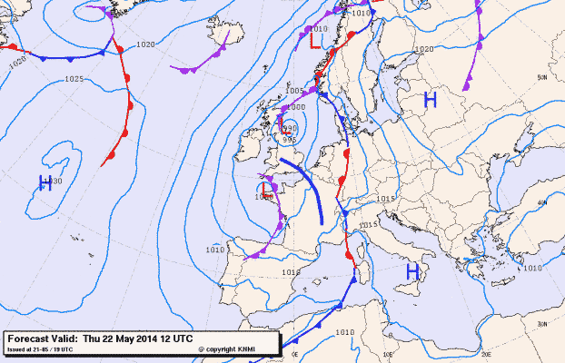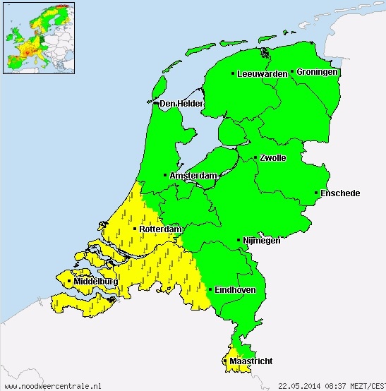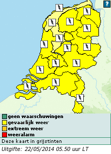 Verder zijn er vandaag perioden met zon en is het aanvankelijk droog. Later vanmiddag en vanavond trekt een gebied met stevige regen- en onweersbuien van zuidwest naar noordoost over het land. Bij deze buien zijn hagel en zware windstoten tot ca. 80 km/uur mogelijk. | Gewijzigd: 22 mei 2014, 06:41 uur, door Tatanka