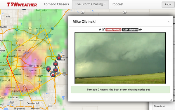 Multiple chasers streaming rotating wall cloud on tornado warned storm near Denver, CO.