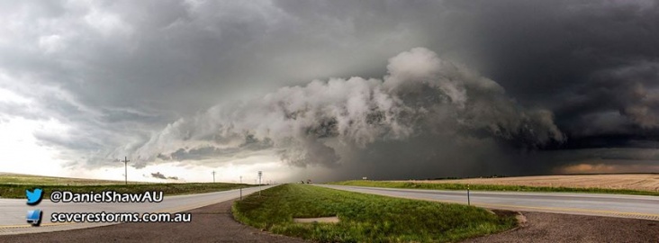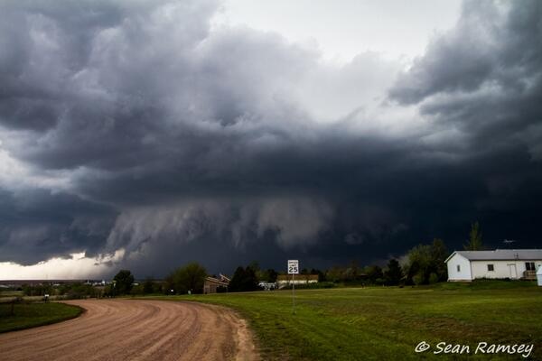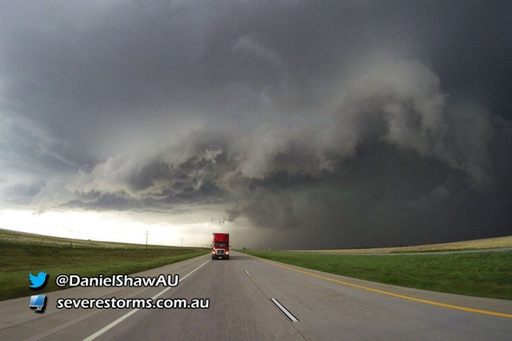 This was taken about 1 mile north of Strasburg, Colorado. Pretty sure this storm is about to produce another tornado.. RFD is wrapping around to the left. Wasn't hanging around to find out. About 6 mins later the storm was tornado warned again