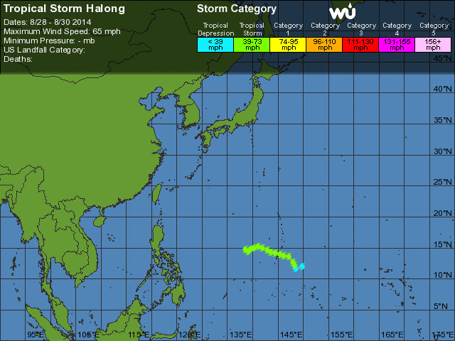 Halong heeft ondertussen de status van tyfoon bereikt. Dit weekeind zal het systeem steeds verder in kracht gaan toenemen. Momenteel heeft Halong een westwaartse koers en trekt weg van Guam. Volgende week draait de tyfoon richting het noordwesten. In dit gebied is de windshear minder. Momenteel lijkt het er op, dat de tyfoon aan land komt in de noordelijke Ryukyu eilanden en in het zuiden van Japan.