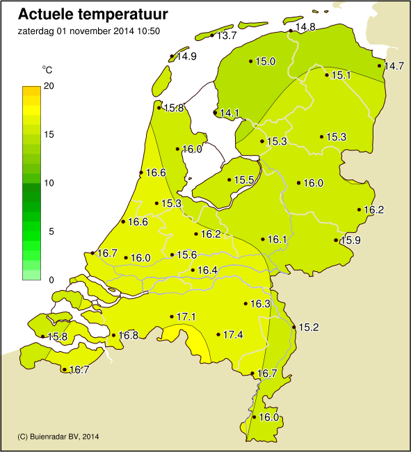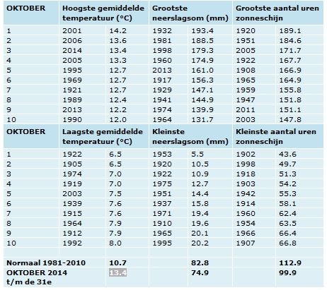 Zoals al eerder aangegeven door Ben47 is Oktober geeindigd met een gemiddelde temperatuur van 13,4 graden.. Ik zelf had verwacht dat ze na de afgelopen 2 warme dagen toch weer naar de 13,7 graden zou opklimmen maar de 13,4 graden bleef staan..