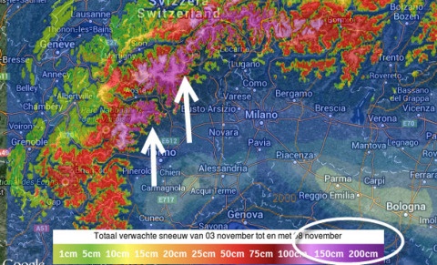 Zoals altijd bij dit soort situaties weer die enorme, zeg maar rustig extreme, verschillen tussen de Alpen noord en zuidkant. Hadden recent nog de mooie dump aan de Oostenrijkse noordkant, nu gaat het dumpen aan de Zwitserse en Italiaanse zuidkant en niet zo zuinig ook. Interessant daarbij is voor ons natuurlijk wat de sneeuwvalgrens gaat doen!