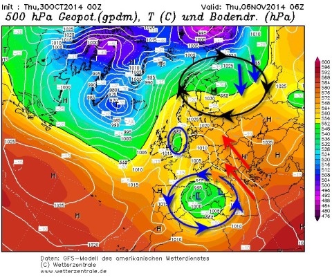 Welnu, het hangt allemaal samen met een hele langzame verschuiving van hoge- en lagedrukgebieden. We zitten deze hele week nog aan de zachte kant met aanhoudende zuidenwinden. Het wordt daardoor tegen de 20 graden in sommige dalen en in de Noordalpen waait de föhn. Zelfs wij in Nederland en België merken dat met andermaal een belachelijk warm weekend voor de boeg (We gaan in de top 3 eindigen van warmste oktobermaanden ooit).