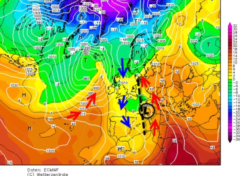 Normaal staat de straalstroom west-oost op Europa gericht maar zoals je ziet zit er nu een gigantische kronkel in. Nu de wind op grote hoogte recht op de Alpen gericht staat, er heel veel vocht vanaf de Middellandse Zee wordt opgepikt en lucht tegen een hooggebergte botst weet je hoe laat het is.