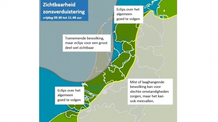 Weerbureau Weerplaza gaat ervan uit dat de eclips in het grootste deel van het land goed te zien is. Wel kunnen er nog wat wolken hangen, maar die zijn waarschijnlijk niet dik genoeg om het zicht op de zon te ontnemen.