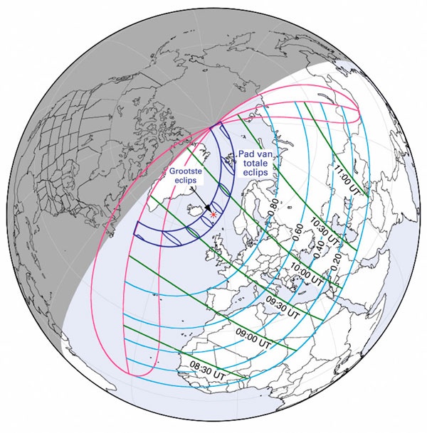 Aanstaande vrijdag vindt echter wederom een grote eclips plaats. Het is een totale zonsverduistering, maar de totaliteitszone blijft ver ten noorden en noordwesten van ons land. Die zone trekt net onder IJsland door, trekt over de Far Oer eilanden en wat later over Spitsbergen, om vervolgens vlak ten zuiden van de Noordpool, te eindigen (zie hiernaast). De positie van de zon en de maan is echter dusdanig, dat de schaduw als het ware langgerekt over geheel Europa valt en er daardoor vrijwel overal in Europa een grote gedeeltelijke eclips valt te bewonderen. Zo wordt bijvoorbeeld in Rome nog 60% van de zonneschijf door de maan weggehapt, in Gibraltar 62% en in Parijs 80%. In ons land is dat rond 84% van de middellijn van de zon, wat effectief betekent dat rond 81% van de zonneschijf, op het hoogtepunt van de eclips, achter de maan is verdwenen. In ons land begint de eclips rond 9.29 uur, als aan de westkant (rechterzijde) van de zon het eerste ‘deukje’ verschijnt. Het hoogtepunt valt rond 10.37 uur en rond 11.48 uur, is de verduistering weer voorbij en is de zon opnieuw ‘heel’ geworden.