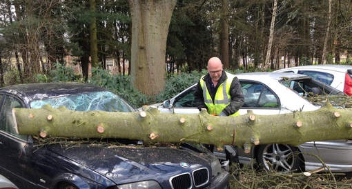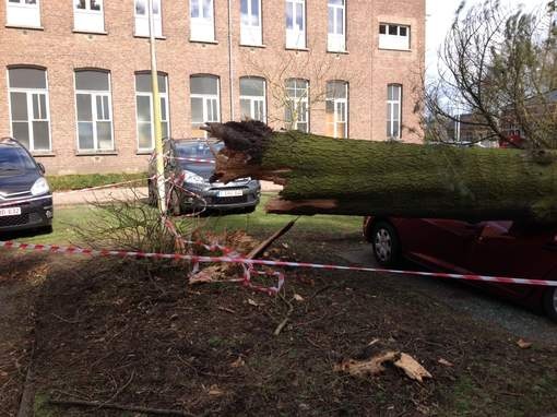 Het stormweer heeft her en der in Vlaanderen lelijk huisgehouden. Zoals hier in Zoersel, waar een grote boom op de parking van het rusthuis Joosten het heeft begeven. In zijn val vernielde de boom maar liefst zes geparkeerde wagens. Nog in Zoersel hebben verschillende bomen voor flink wat verkeershinder gezorgd.