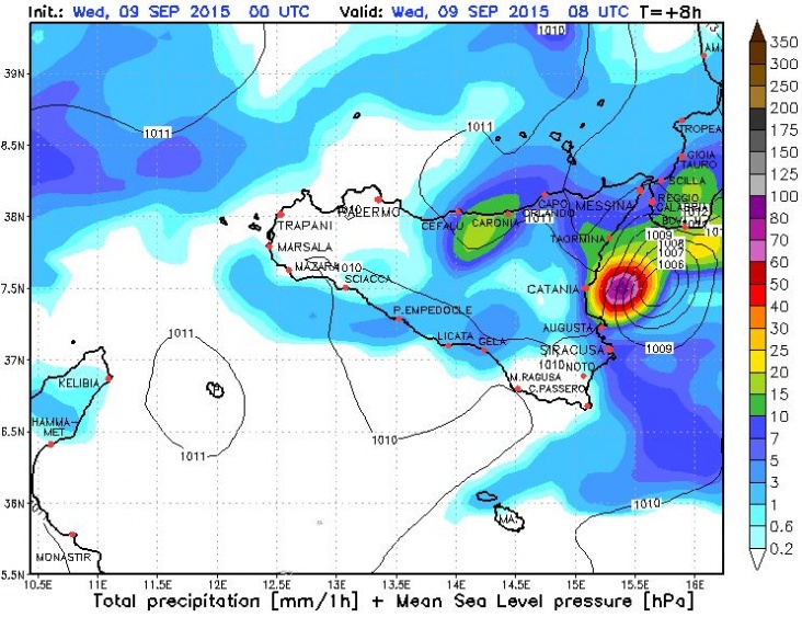 De verachting voor vanmorgen 10u was een intensitiet tot 80mm per uur in de buurt van Catania, Sicilië.
