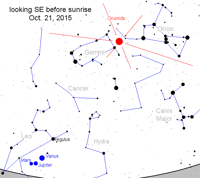 Earth is passing through a stream of debris from Halley's Comet, source of the annual Orionid meteor shower. Forecasters expect the shower to peak on Oct. 20-21 with as many as 20 meteors per hour. The best time to look is during the dark hours before sunrise on Wednesday the 21st: sky map.