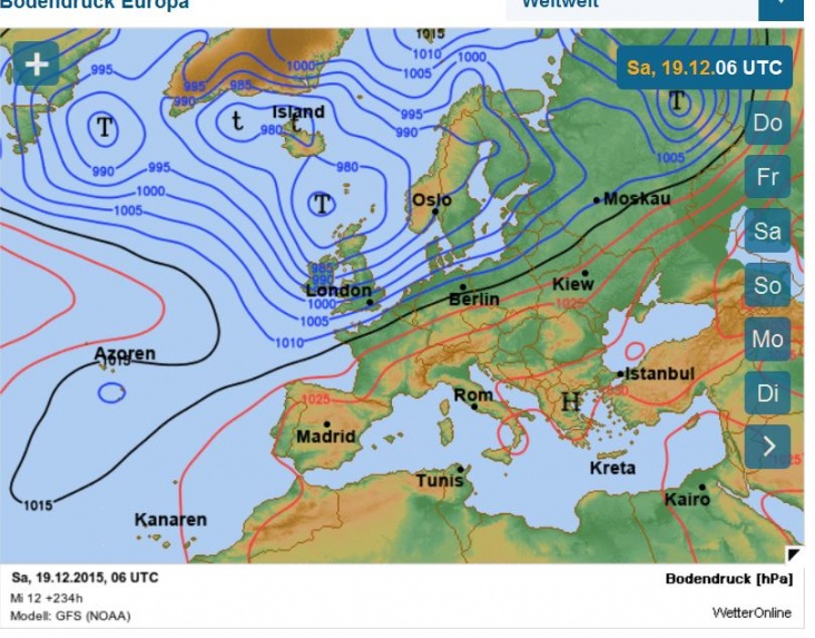 Een langgerekt hogedrukgebied van zuid-Zweden tot aan Kroatië. Ook hier Arctische lucht over Finland naar het zuiden dat uiteindelijk opgewarmd maar nog koud Turkije en Griekenland bereikt. Wij blijven in een zuidelijke stroming dankzij een Hoog boven Spanje en een laag bij de ....Azoren. Hopelijk gaat het laagje bij Corsica/Sardinië zich tot een flink lagedruk uitdiepen. De druk boven oost-Europa doet afnemen, terwijl het boven Zweden blijft bestaan. In dat geval komt er een oostelijke stroming op gang waarbij de koude lucht ons kan bereiken.