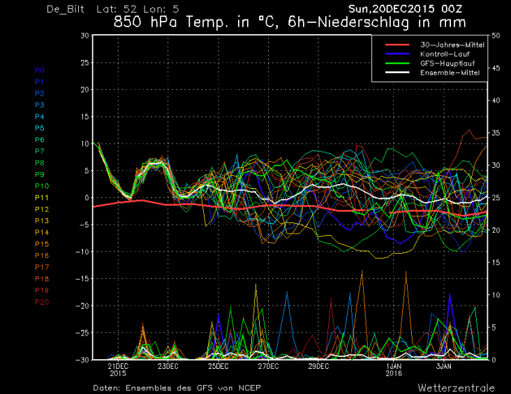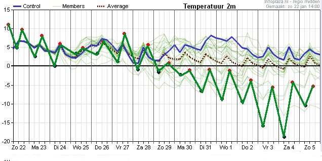 Nee, naar gemiddelden voor een LT verwachting kijk ik nooit. Die heeft net zo onmetelijke grote onzekerheid als elk individueel lid. Kijk maar eens hieronder naar de pluim van 22 januari 2012. De dikke groene lijn is het werkelijke verloop van de temperatuur geweest.