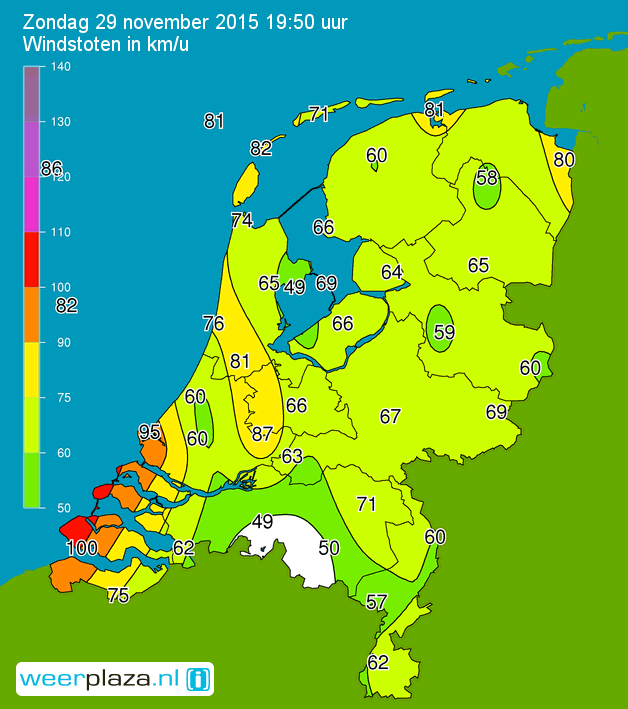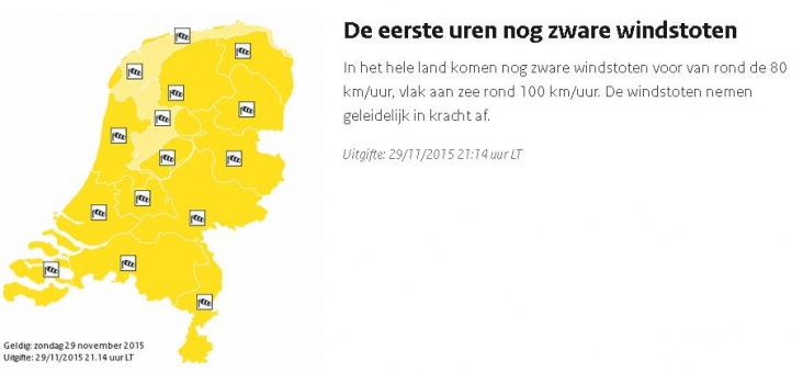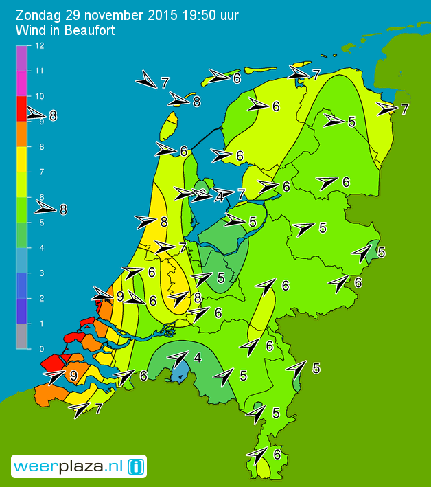 Langs de kust meest hard of stormachtig met in Zeeland zelfs even storm. Boven land is de wind meest matig tot (vrij) krachtig. Verder komen er windstoten voor die kunnen oplopen tot 80-100 km/uur langs de kust en boven land rond de 50 km/uur. Later in de avond neemt de wind vanuit het noorden weer af en wordt het rustig