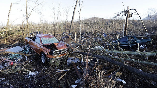 Voertuigen en puin liggen verspreid in een gebied in de buurt van Linden , Tenn . , Donderdag 24 december , 2015. ( AP Photo / Mark Humphrey )