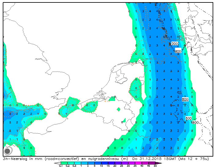 Waar het exact om middernacht zal regenen, valt nu nog niet aan te geven. Alle weermodellen berekenen een regengebied dat in de loop van donderdag, 31 december, vanuit het westen Nederland binnentrekt. Deze regenzone komt volgens enkele berekeningen tot stilstand boven ons land. In de avond en nacht naar 2016 zal het volgens dit scenario dan langdurig regenen of miezeren.