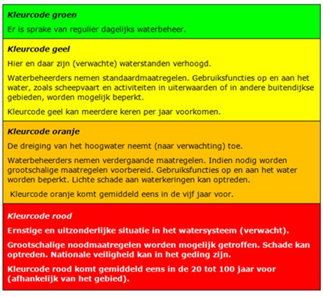 De landelijke kleurcodering voor de (verwachte) watersituatie is vergelijkbaar met de waarschuwingssystematiek voor het weer. Het geeft een beeld van de (verwachte) toestand van het Nederlandse watersysteem.