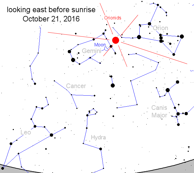 The best time to look is during the hours before local sunrise on Oct. 21st when Orion is high in the sky. Unfortunately, the gibbous Moon will be high in the sky, too. Only the brightest Orionids will be visible through the glare. Now for the good news: NASA's network of all-sky meteor cameras recorded 17 Orionid fireballs over the USA the night before the peak. It might be worth looking, after all. [sky map]