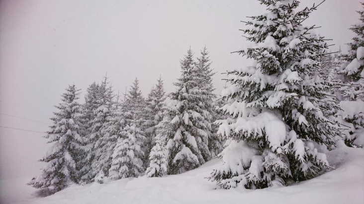 Flinke sneeuwval als we aankomen en dat terwijl er al een enorm pak vers gevallen is. Het sneeuwt de hele dag door en op de toppen van de berg is het ijzig koud met een flinke wind. Ca. -4 tot -6 in het dal en zo'n -10/-11 op de top.