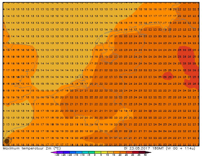 Maandag een op en top warme dag op grote schaal 22-23 graden zuidelijk benelux mag op 24-25 graden rekenen.