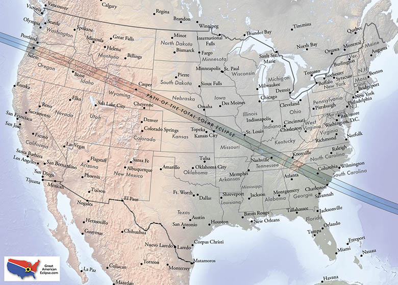 Dit is de eerstvolgende totale zonsverduistering waar heel veel liefhebbers naar uitkijken: een eclips in de zomer midden in de Verenigde Staten! Niet alleen zullen zeer veel Amerikanen hun best doen om in het eclipspad te komen, maar ook veel buitenlandse toeristen zullen deze gelegenheid aangrijpen voor een bezoek aan de VS.De grootste duur van de totaliteit van deze eclips is 2 m 40 s in de staat Kentucky. Maar zelfs twee minuten aan de westkust van de VS is nog interessant. Het eclipspad loopt van west naar oost, van Oregon over Idaho, Wyoming, Nebraska, Kansas, Missouri, Kentucky, Tennessee, naar South Carolina, en passeert daarbij toeristisch interessante plaatsen als Yellowstone National Park en Nashville.