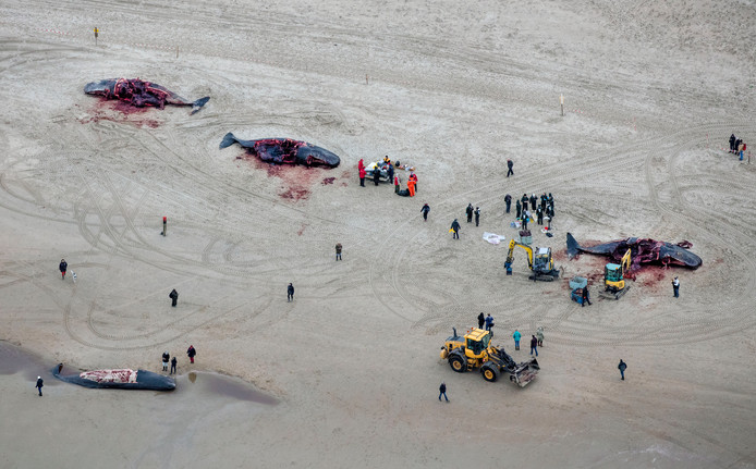Luchtfotografie van de potvissen die op het strand van Texel aanspoelden. © AD