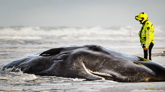 Een agent bij een van de aangespoelde potvissen op het strand van Texel in januari 2016. De dieren zouden volgens nieuw onderzoek in de war zijn geraakt door het noorderlicht. © AD
