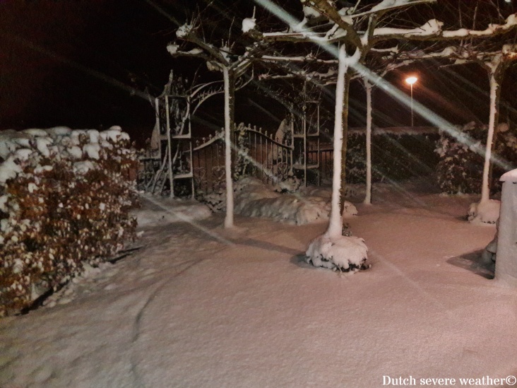 Dit is plus de sneeuwdek van gisteren toen had ik 6 cm .. Ik heb om half 8 vanavond gemeten op 4 verschillende punten. En toen zat ik gemiddeld rond 17cm het sneeuwt nou nog steeds gestaag door. Maar gezien de radar zal ook hier, er een einde aan komen binnen nou en een uurtje. Sneeuwaccumulatie zal dus ergens tussen de 17-20 cm liggen, ik vind het prima zo. Ik ga niet nog een keer naar buiten, ik zit al sinds zaterdagavond met koorts. Vandaag is er dus een goeie 10+ cm bijgevallen.