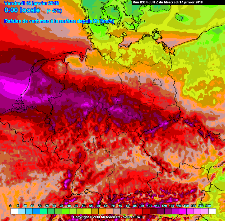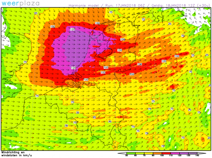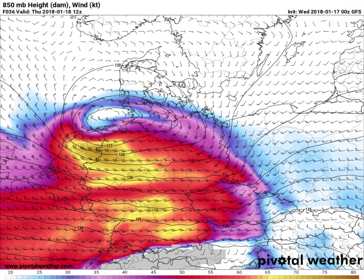 850hpa wind donderdag 12z. Goede indicatie mogelijke windstoten. Tot 140-150 km/h.
