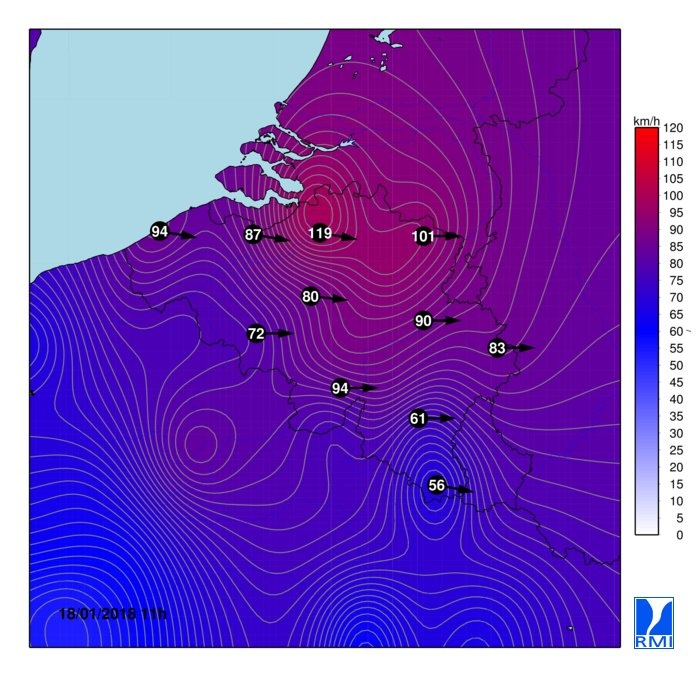 Laatste update KNMI: De zware westerstorm was vanochtend al verder uitgediept dan in de computerberekeningen. Ook de druktendensen waren lager. Daarmee werd duidelijk dat het worstcasescenario+ gevolgd moest worden. De komende uren trekt het zwaarste windveld verder oostwaarts en komt ook langzaam iets noordelijker te liggen. Op basis van het stormgetal van Tijm komen de nieuwste modelberekeningen allen met een top-10-notering. Actueel staat deze storm, Fionn gedoopt door de Britten/Ieren en Friederike door de Duitsers, op de 10e plaats sinds 1971. | Gewijzigd: 18 januari 2018, 11:18 uur, door Sven