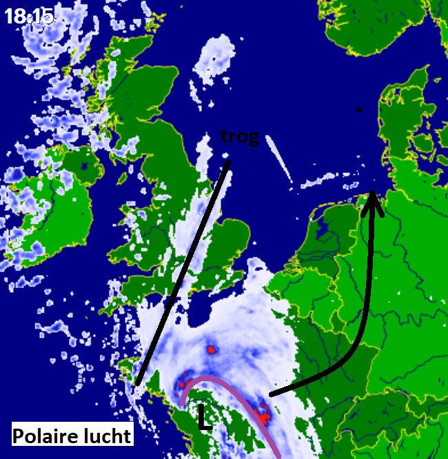 Dit is zo een mooi voorbeeldje waarbij je ziet dat de kern van een laag ten noord(westen) van ons landje ligt waardoor wij koude lucht krijgen uit het noorden..