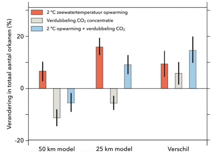 In een nieuwe studie hebben we dit hogeresolutiemodel (25 km) vergeleken met zichzelf op lagere resolutie (50 km). Zoals verwacht geven de twee versies van het model verschillende projecties voor de toekomst, met een toename van orkanen bij de hoge resolutie en een afname bij de lage resolutie (blauwe balken in figuur 1). Er is dus een proces dat afhangt van de modelresolutie want de modellen zijn verder gelijk.