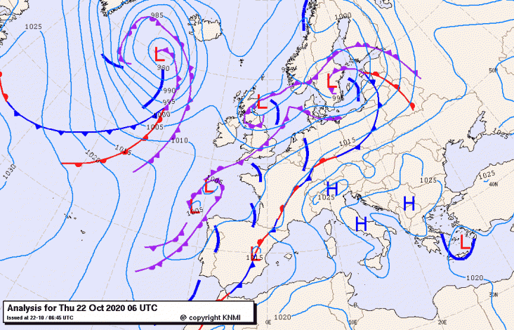 Een diep laag zuidoost van IJsland (945 hPa om 18 UTC) zorgt voor een zuidwestelijke stroming over het aandachtsgebied. Bijbehorend occluderend frontaal systeem, horende bij een laag ten zuiden van IJsland bereikt in de avond ons land. Het NNW-ZZO georienteerde warmtefront bereikt aan het begin van de avond het zuidwesten en passeert vanavond het land. In de warme sector is de luchtsoort van tropische oorsprong. Het koufront bereikt het zuidwesten halverwege de avond en verlaat rond middernacht het oosten van het land. Achter het koufront wordt met een stevige west- tot zuidwestelijke stroming maritiem polaire lucht aangevoerd. Ook op hoogte spreidt zich dan een bel met koude polaire lucht boven onze omgeving uit. Morgen koelt de bovenlucht daarbij op nadering van een grootschalige hoogtetrog fors af naar ca. -30°C op 500 hPa. <= één van de oorzaken van de onstabiliteit