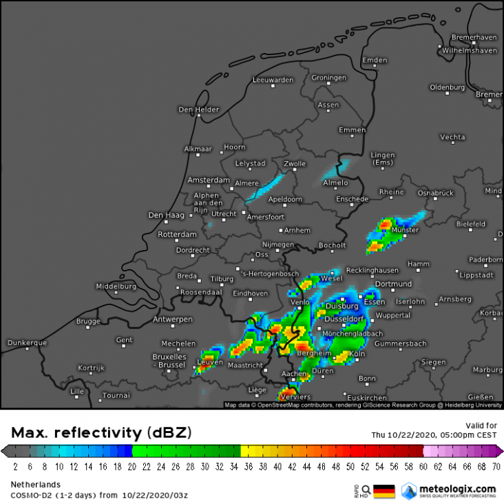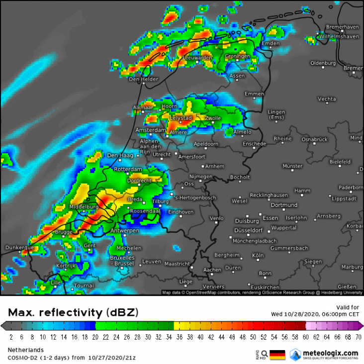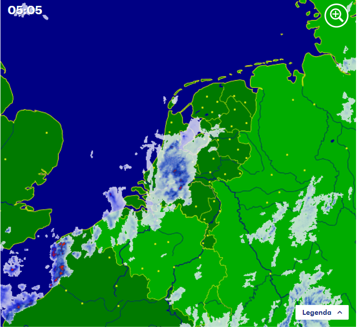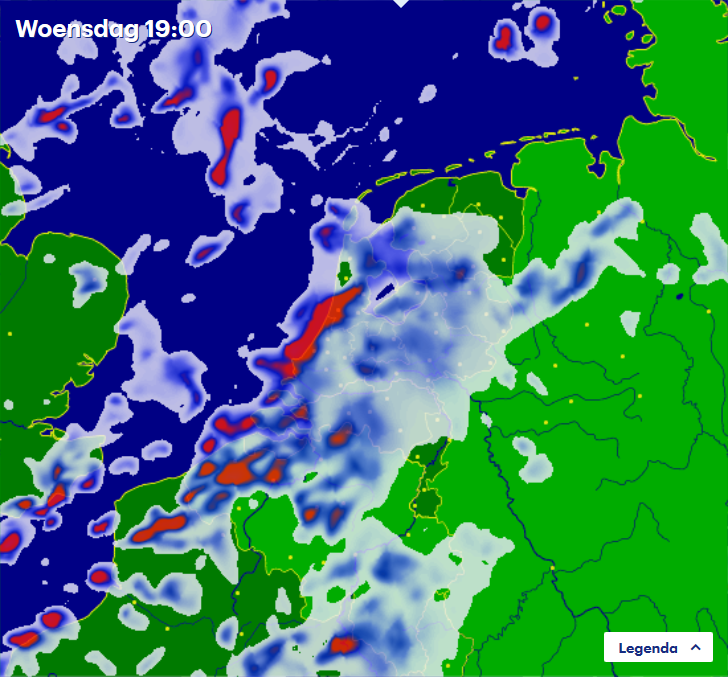 Cosmo laat het in de ochtend een beetje buiig regenen aan de kust en komt pas om 15:00 echt met zwaardere exemplaren vanuit het zuidwesten.