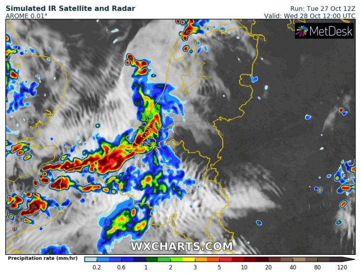 Morgen stevige regen- en onweersbuien, mogelijk met hagel en windstoten. Bron afbeelding: WXCharts.eu