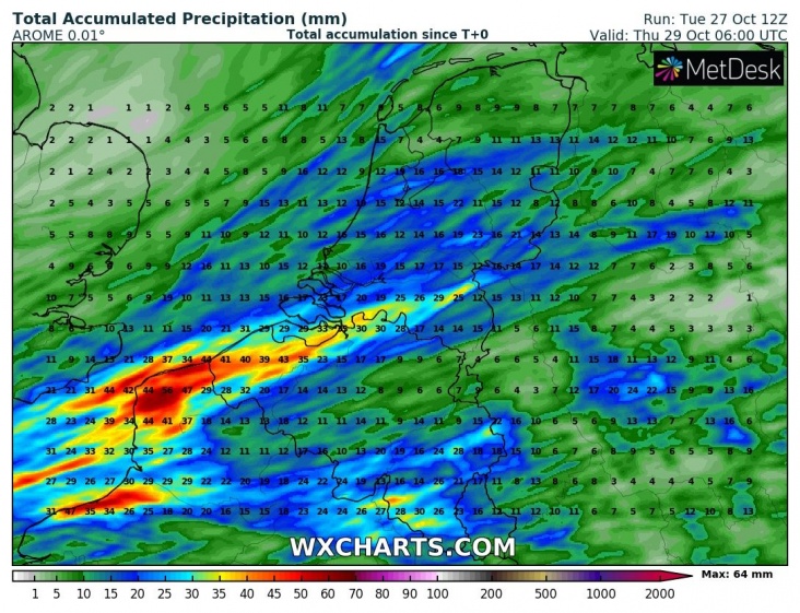 Doordat de neerslaggebieden in het zuidwesten evenwijdig aan de stroming komen te liggen kan er morgen vooral in het zuidwesten lokaal veel neerslag vallen. De Harmonies, komen met een gebied 20-40 mm en zelfs 40+ mm. In de Harmonies zien we in het zuidwesten (fetch vanuit Het Kanaal) zelfs 50-70 mm, daar waar langere tijd convectieve neerslag valt, dit is een aandachtspunt. Kans in KEPS op >50 mm in 24 hr is beperkt, 20%. Te weinig voor een gele waarschuwing, hoewel een lokale 50 mm in Zeeland goed mogelijk lijkt.