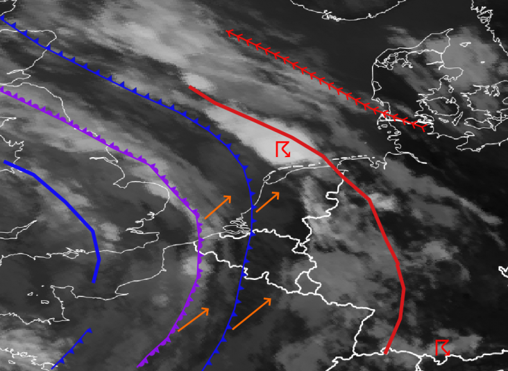 Momenteel ligt de Benelux midden in een reeks van fronten. We hebben een convergentiezone en een vore gehad. De vore gaf een uur geleden nog onweer boven delen van Friesland en de Waddenzee. Momenteel is het tijdelijk rustiger.
