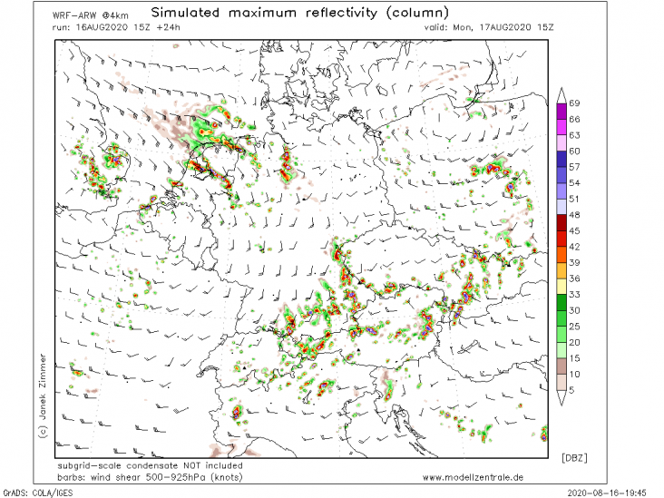 Wrf 4km en Cosmo laten in de komende uren een mcs ontstaan tussen de Vogezen welke vannacht en morgenochtend langs de oostgrens trekt terwijl harmonie helemaal niets laat zien. Wrf 4km laat dit complex na een tijdelijke verzwakking in de ochtend weer activeren rond de middag in het noorden van Nederland. Cosmo is wat oostelijker en laat het meeste buiten de Benelux. Dit wordt dus de komende uren nowcasten of er in het gebied tussen de Ardennen en de Vogezen nog wat zal ontstaan.