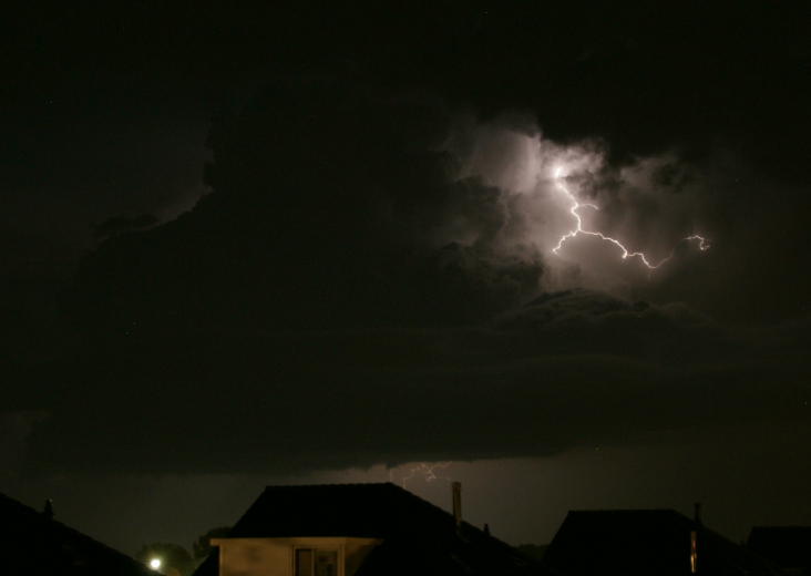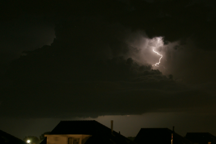 Vanaf dat moment werd het spannend. Zouden er nog onweersbuien ontstaan? Zouden het supercells zijn? Zoals gisterochtend al geschreven, was de kans daarop niet groot, maar ook weer niet helemaal nul. Tot halverwege de avond bleef het rustig, daarna verrieden onrustige wolken boven het westen van het land dat er toch iets stond te gebeuren. Even later was het zover. Boven België kwam een supercell tot ontwikkeling die langs Breda naar het noorden trok. Andere buien ontstonden boven Noord-Holland en het Markermeer.