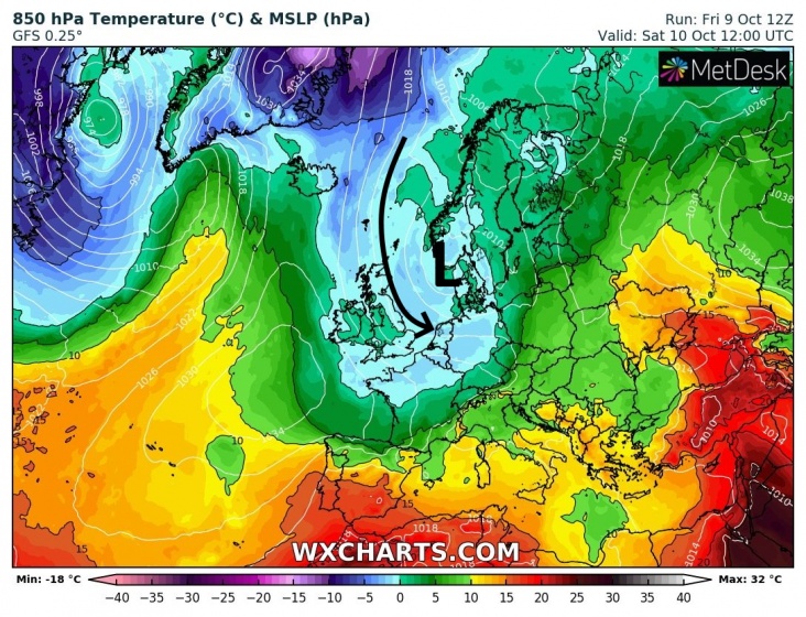 Onder een tijdelijke rug op de oceaan, en een diep lagedrukgebied boven Lapland, kan er tijdelijk een diepe noordelijke stroming ontstaan. Komende nacht neemt het lagedrukgebied bij Lapland de juiste positie in en kan de koude lucht uitstromen van Spitsbergen tot aan de Alpen.