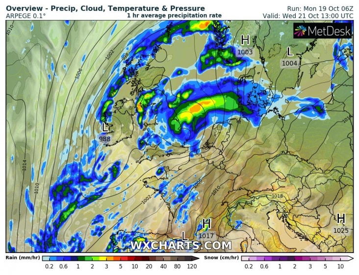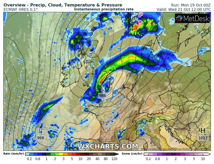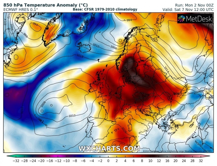 We zien boven Frankrijk een gebied met afwijkingen van 8 tot 12°C boven normaal. In Frankrijk kan het lokaal op 1,5 km hoogte 17 tot 20°C worden(!). Dit zijn uitzonderlijke waardes voor de tweede helft van oktober.