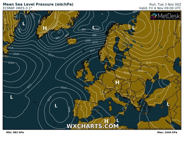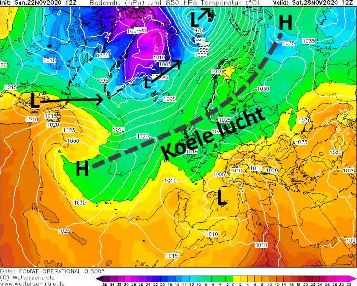 Een rug bouwt zich op, terwijl het nog oostwaarts trekt. Dit is het startschot voor de opbouw van een tijdelijk scandihoog later. Helaas moeten we wel de observatie maken dat er erg weinig kou voorradig is tot over de Oeral, dus stél dat we een scandihoog zouden zien, is een winterinval onwaarschijnlijk.