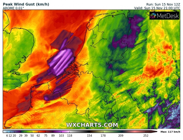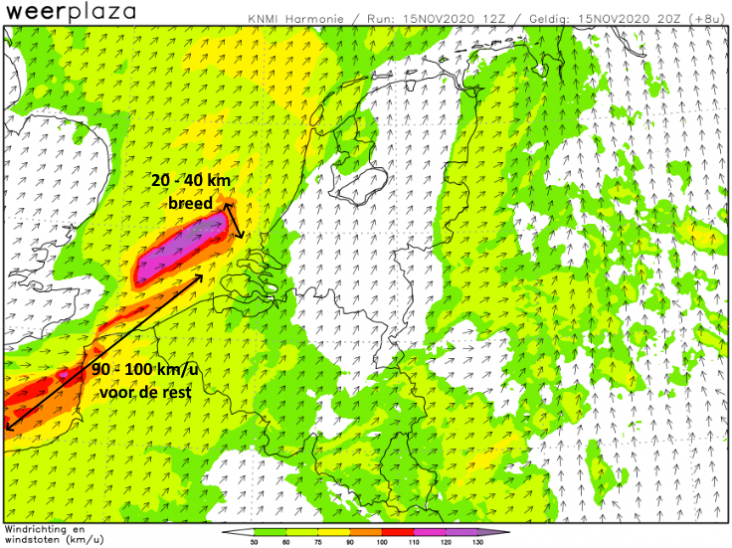 In Arome zien we een scenario tussen Harmonie en Cosmo in, maximaal 110 km/u op een iets grotere schaal. De kans op storm is klein doordat dit slechts een kortdurend windmaximum is.