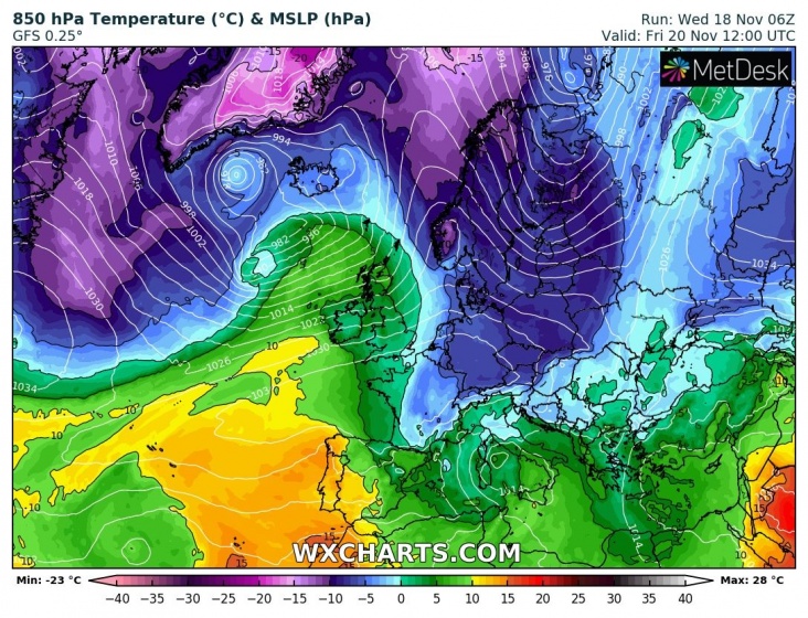 24 uur later zien we een warmtefront vanuit het westen echter al warmere lucht brengen. Een krachtig lagedrukgebied gaat voor anker bij IJsland.