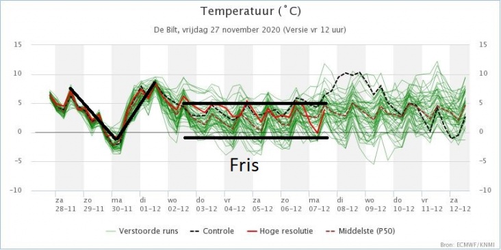 Kijken we iets verder al naar de start van de winter, dan gaan de temperaturen weer richting 10 graden, maar dan heel tijdelijk. We lijken de eerste week van de winter te starten met maxima onder 5 graden en minima die flirten met het vriespunt.