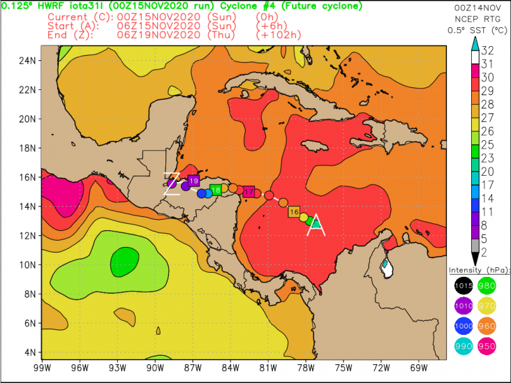 Zeetemperaturen van ongeveer 30°C zijn de oorzaak van de snelle groei. Een minimale luchtdruk van 950 hPa is goed mogelijk vlak voordat de kern van Iota de kust opkomt. De nummers staan voor de datum waarop de orkaan ergens aankomt, verwachte landfall is dus op 17 november.