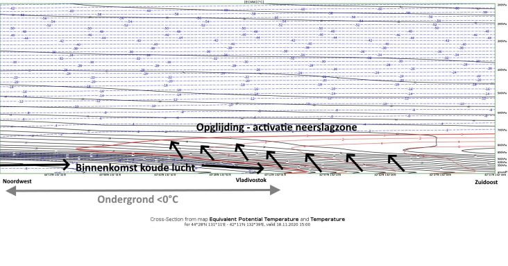 2. 18 november: We zien de windrichting aan de grond draaien naar noord. De warme lucht wordt omhoog geduwt. Dit zijn stijgende luchtbewegingen, welke lijden tot condensatie en zodoende de activeren van de neerslagzone. Het begint te regenen, maar de regio met vrieslucht reikt al tot Vladivostok, het begint dus te ijzelen.