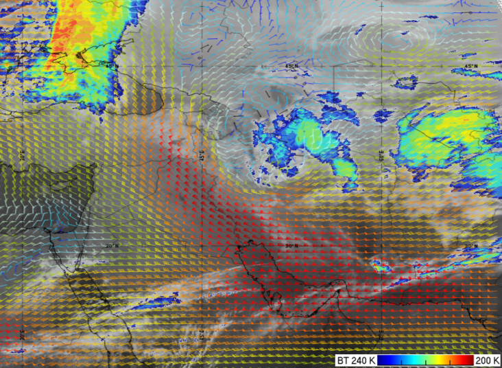 De zwaarste buien vinden we aan de kust van de Kaspische zee (die helaas geen grenzen heeft op onderstaande kaart). Dit herkennen we aan de koudste buientoppen (220 K of -50°C). Rond dit hoogtelaag vinden we op 5 km hoogte windsnelheden van 180 km/u. De hoogste bergtoppen krijgen ook het meeste mee van zo'n hoogtelaag. In de dalen zal het weinig gewaaid hebben.