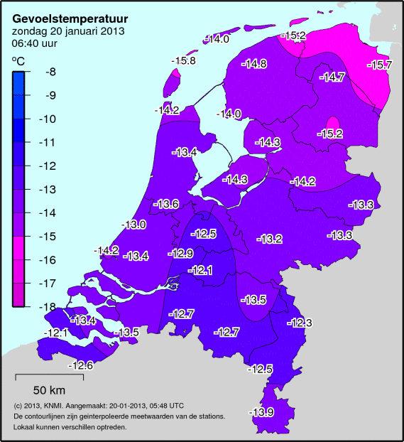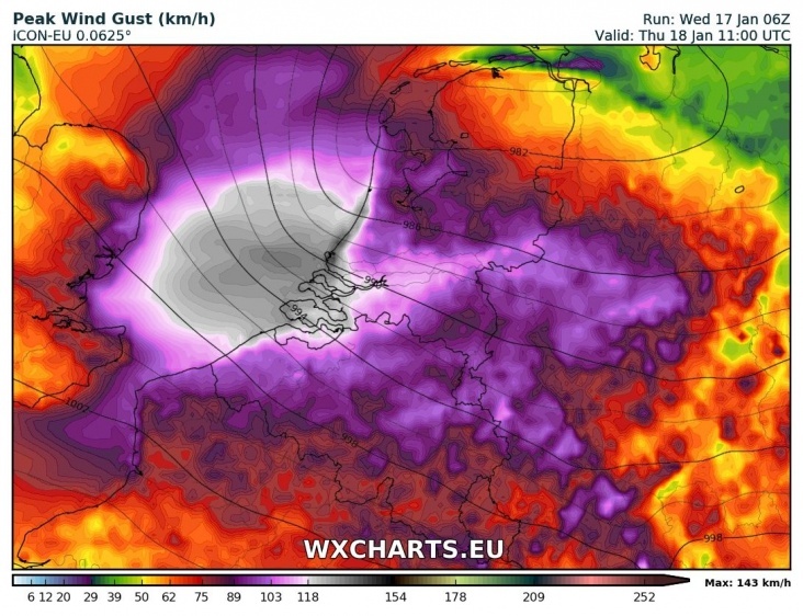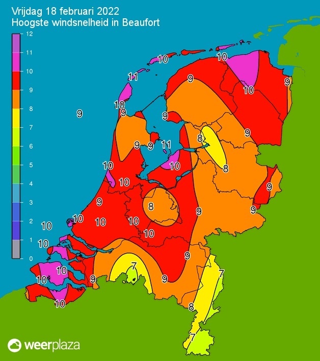 8 Bft langs de kust met uitschieters van 75-90 km/uur, bij een bui landinwaarts mogelijk ca. 100 km/uur. Langs de noordkust de komende uren nog 9 Bft met uitschieters tot ca. 100 km/uur. Overdag neemt de wind geleidelijk van het zuiden af, tot ca. 6 Bft aan het einde van de avond. Vrijdagmiddag wegens de nadering van Eunice toenemend naar zware storm, 10 Bft. Dan zijn (zeer) zware windstoten mogelijk van 90-120 km/uur, langs de kust en het IJsselmeer tot 130 km/uur. KEPS en ECEPS kansen op deze windstoten zijn hoog.