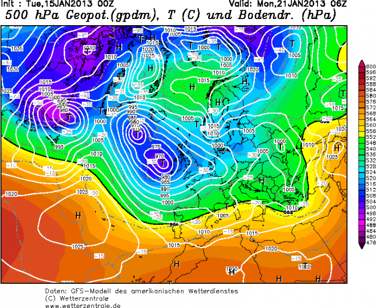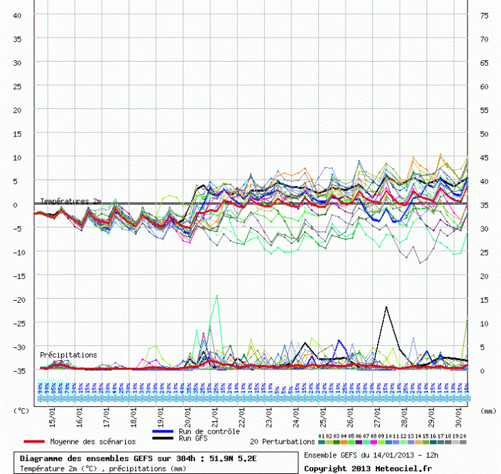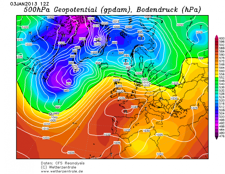 Januari 2013 begon zacht, tussen 2 en 7 januari kwam het kwik vaak rond of boven de 10°C. Het was bewolkt met langdurig motregen, met een WC (westcirculatie) onder leiding van hardnekkige lagedruk bij IJsland.