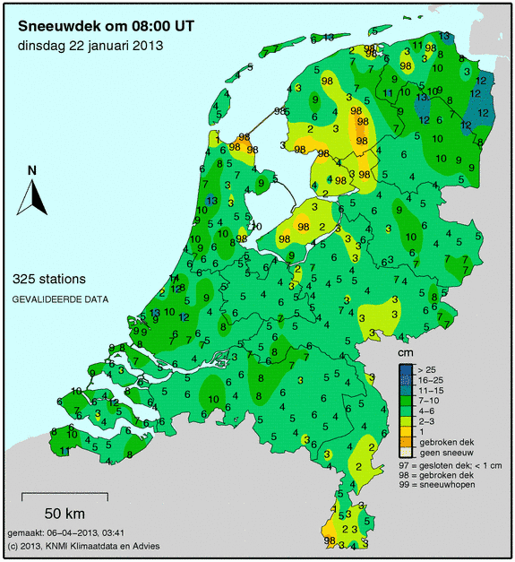 Hele dag lang sneeuwval, kleine verstuivingen.